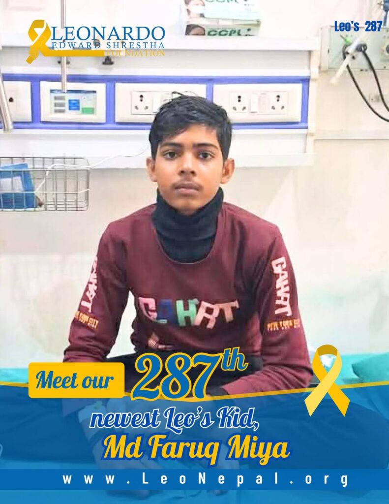 We are honored to welcome Md Faruq Miya, a brave 15-year-old young man from Kapilvastu, to our Leo’s Kids family. Md Faruq is currently fighting Blood Cancer and is receiving treatment at Bharatpur Cancer Hospital.