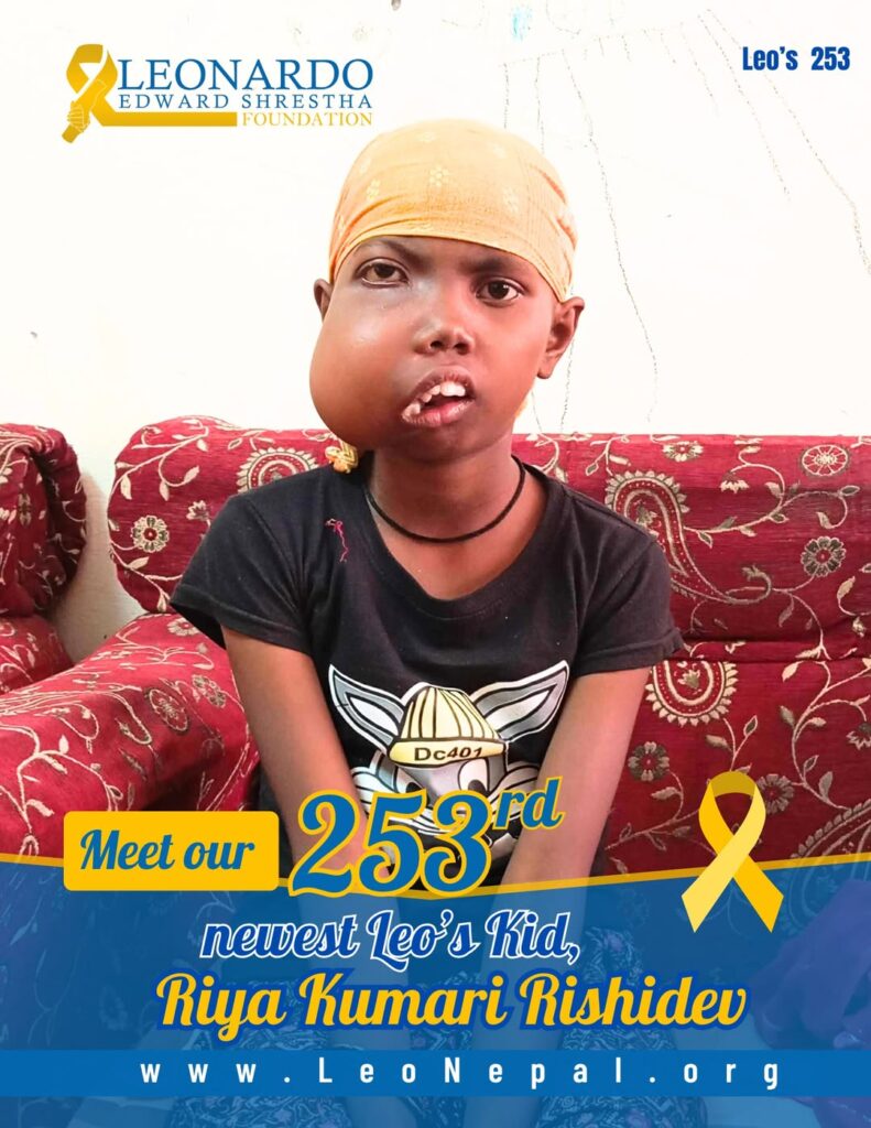 We are so honored to welcome our 253rd Leo’s Kid, Riya Kumari Rishidev! This brave 13-year-old girl from Morang is currently undergoing treatment for Cheek Cancer at Nepal Cancer Hospital in Harishiddhi.